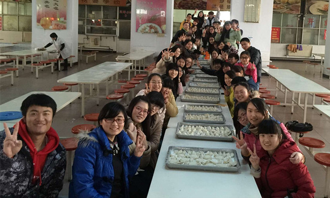 在冬至日下午2:30,14级化学专业全体55名同学聚集在餐厅,餐厅工作人员先给同学们做示范。接下来同学们各显其能,擀皮的擀皮,包饺子的包饺子,奇形怪状的饺子不时出现,虽然引得大家爆笑不已,但那是每个人自己的创意,体现的是各个地方的不同风俗和饺子样式。大家围绕学习、生活和工作等话题不时的交谈着,憧憬着自己也能成为“娇子”。