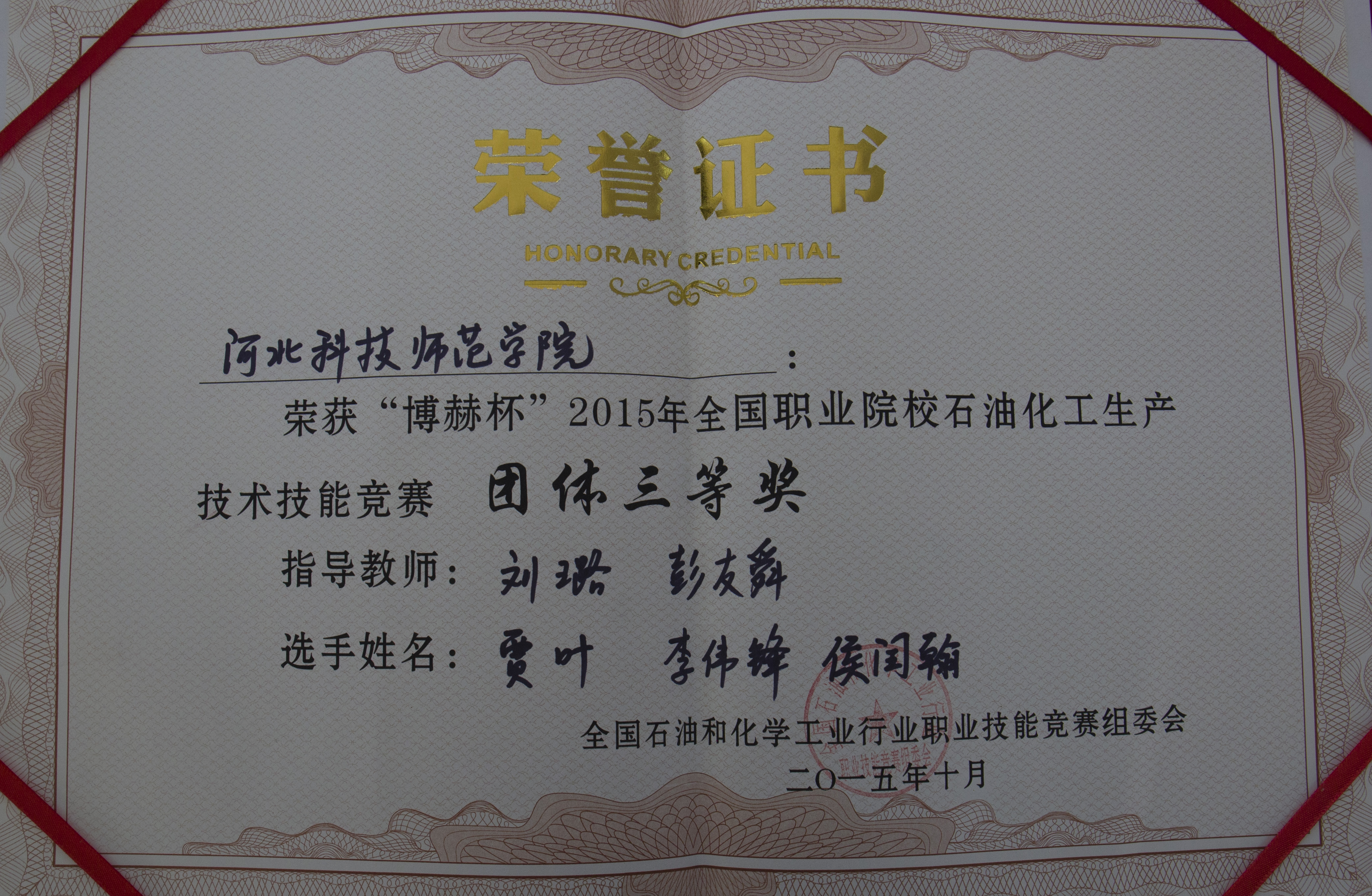 2015年10月23日至25日,全国石油和化工行业职业技能竞赛组委会主办了“博赫杯”2015年全国职业院校石油化工生产技术技能竞赛”,来自全国各地的26支队伍78名选手进行了角逐。公司365英国上市公司组织参加了本次比赛,彭友舜经理任领队,刘璐老师任指导教师,2012级化学、应用化学专业贾叶、李伟锋、侯闰翰三位同学代表公司参加了比赛。在仿真和实操竞赛过程中,队员准备充分,配合默契,表现突出,比赛成绩在本科院校中排名第一,荣获了本次技能竞赛团体三等奖,刘璐老师荣获得了“优秀指导教师”称号。