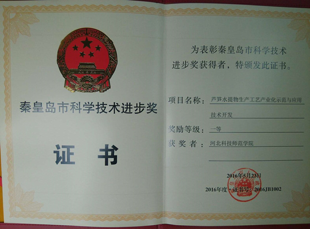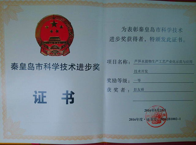 日前,公司365英国上市公司经理彭友舜教授主持的《芦笋水提物生产工艺产业化示范与应用技术开发》课题荣获秦皇岛市科学技术进步奖一等奖。