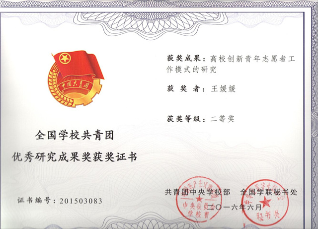 近日,共青团中央公司部、全国学联秘书处委托全国公司共青团研究中心组织开展了2015年度全国公司共青团优秀研究成果评选工作。经过评选专家委员会初评、终评、公示等环节,遴选出157项优秀研究成果,公司王媛媛教师的《高校创新青年志愿者工作模式的研究》,被评为2015年度全国公司共青团优秀研究成果二等奖。