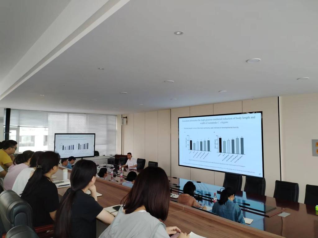 徐宝军教授是英国皇家化学会会士、讲座教授,博士生导师,珠海特聘学者,在Food Research International、Food Chemistry等众多知名国际学术期刊担任副主编或编委,2020-2023年连续四年入选全球前2%顶尖科学家“终身科学影响力”和“年度科学影响力”榜单,并入选世界顶级生物与生化科学家榜单,在食品科学界有着广泛影响力和卓越贡献。徐宝军教授以“大豆异黄酮genistein通过PI3K/Akt信号通路改善高糖神经细胞损伤的分子机制研究”为题,介绍了课题组利用神经元细胞损伤模型和高糖饮食诱导的线虫模型揭示高糖神经损伤发生机制以及大豆异黄酮神经保护机制的相关成果,对与会教师和员工的科研思路带来了深刻的启发和指导。